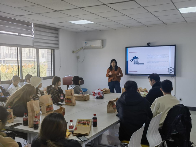 之后,法国雷恩商公司中国区负责人陈璐老师向同学们介绍了法国雷恩商公司的地理位置,文化环境,公司地位等人文环境优势以及公司独特的教学理念。她给同学们播放了雷恩商公司相关的宣传片,向在场的同学讲解报考雷恩商公司的优势。活动尾声,师生们对于国际交流进行了热烈的讨论,陈璐老师也对员工国际交流的相关问题进行回答和指点。