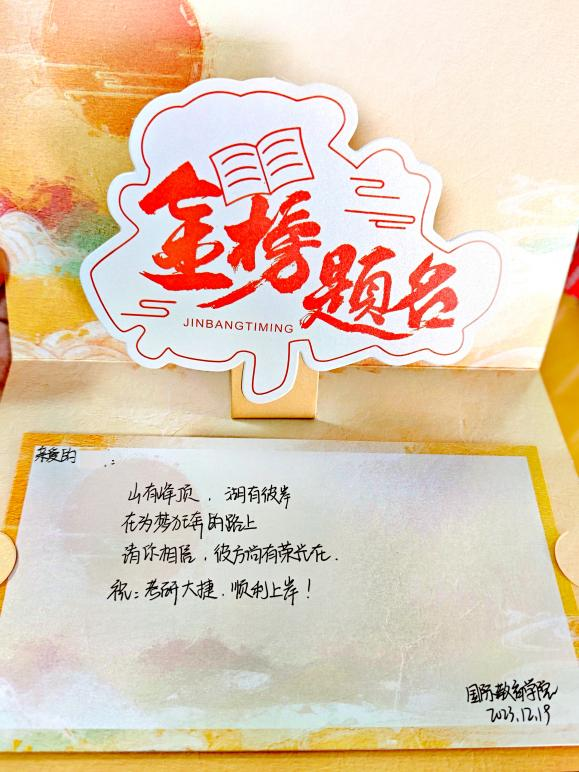 活动伊始,靳洪经理鼓励考研学子们近日要调整好心态和作息,以饱满的精神在考场上冷静答题,发挥百分百的实力。随后,在场的老师们也纷纷向考研学子的深切祝福,鼓励同学们坚定目标、怀揣信心、积极应考。一句句美好的祝福,一声声温暖的问候,让备战考研的同学们倍受感动。